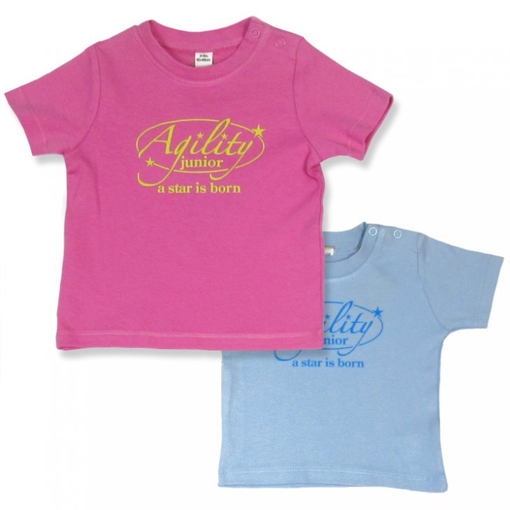 T-shirt for babies with nickel-free snap fasteners over the shoulder for easy on and off. On the front an imprint "Agility Junior, a star is born". Available in pink and lightblue