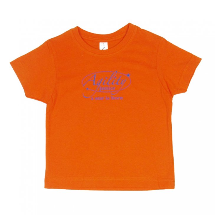 Kids T-Shirt in orange with an "Agility Junior, a star is born" imprint in blue
