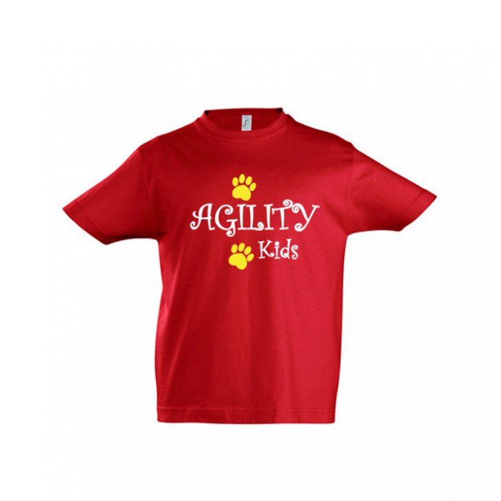 Kids T-Shirt in red with white "Agility Kids" lettering and two yellow paws