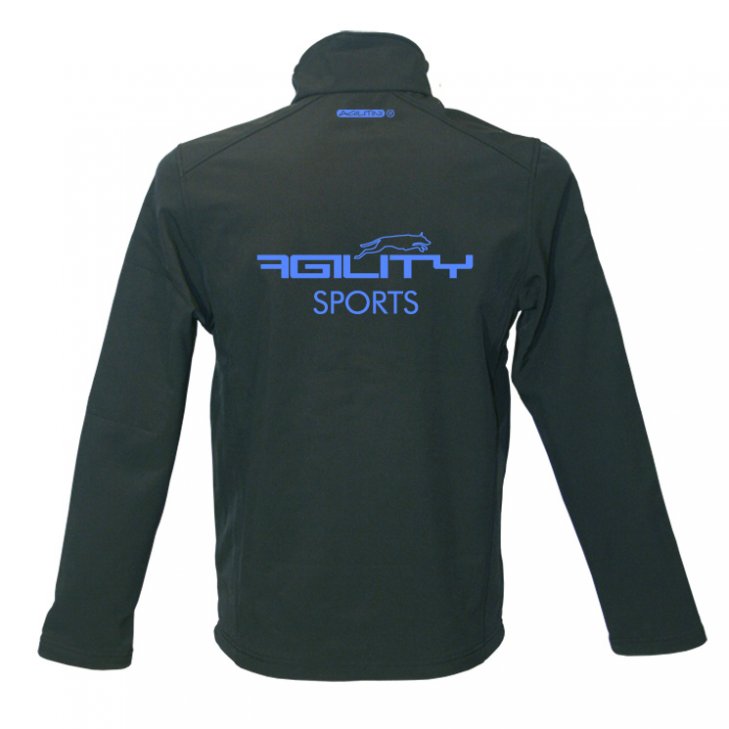 Softshell jacket for men in black, on the back "Agility Sports" lettering and silhouette of jumping dog in blue