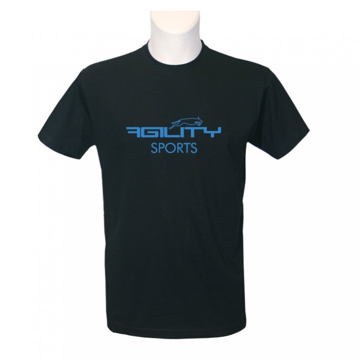 T-Shirt for Men in black with blue "Agility Sports" lettering and silhouette of jumping dog in blue