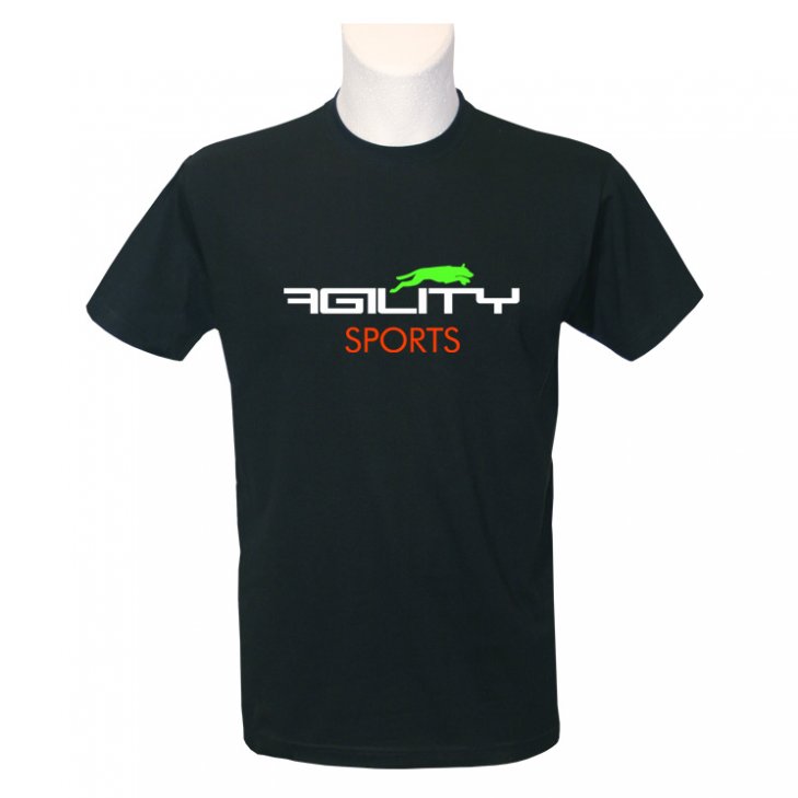 T-Shirt for Men in black with white/red "Agility Sports" lettering and silhouette of jumping dog in green