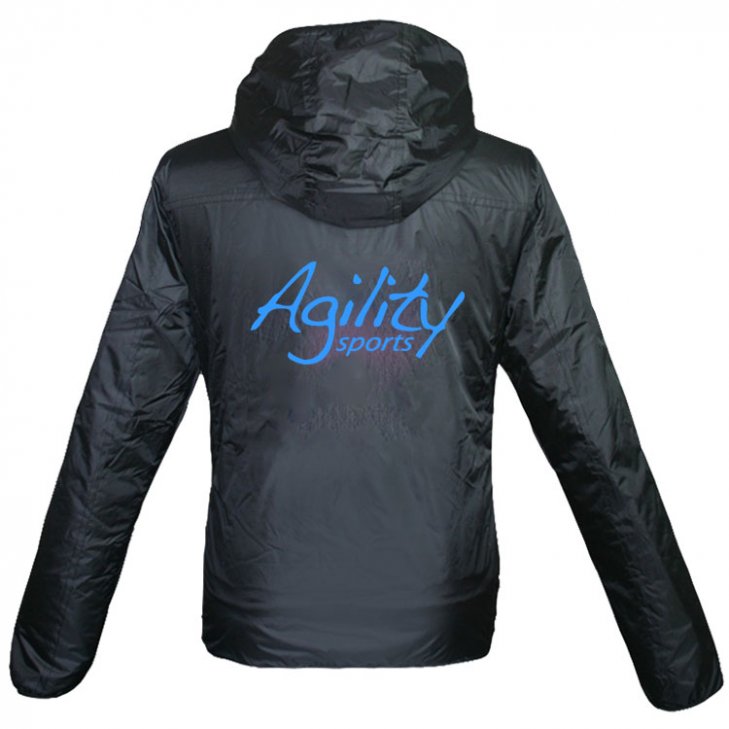 Sporty men's winter jacket in black. Wind and water repellent. Warming teddy lining in off-white and adjustable hood. Reflective piping on sleeves. On the back "Agility Sports" lettering in blue.