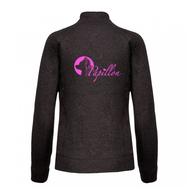 Knit Fleece jacket for women without hood in darkgey with roughened lining. Two side pockets with a contrasting zip and a breast pocket with zipper. On the left side of the chest a papillon head and on the back a papillon head silhouette and a "Papillon" lettering in pink (embroidered).