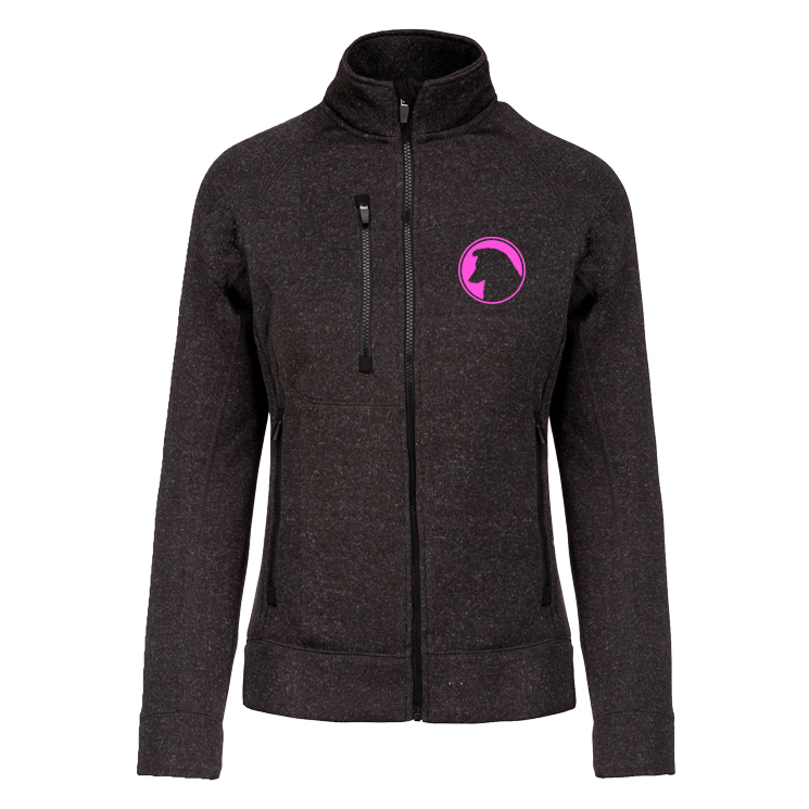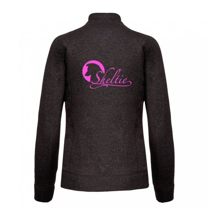 Knit Fleece jacket for women without hood in darkgey with roughened lining. Two side pockets with a contrasting zip and a breast pocket with zipper. On the left side of the chest a sheltie head and on the back a sheltie head silhouette and a "Sheltie" lettering in pink (embroidered).