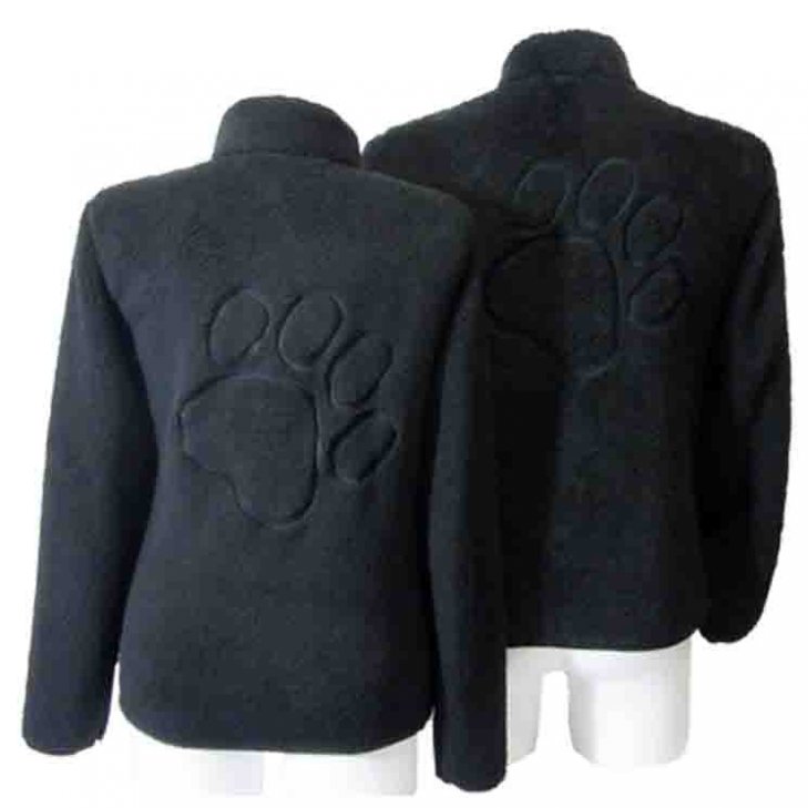 Fluffy, soft unisex teddy fleece jacket in black. Regular cut with zip and side pockets with zip. A large embroidered paw in black on the back.
