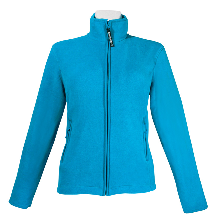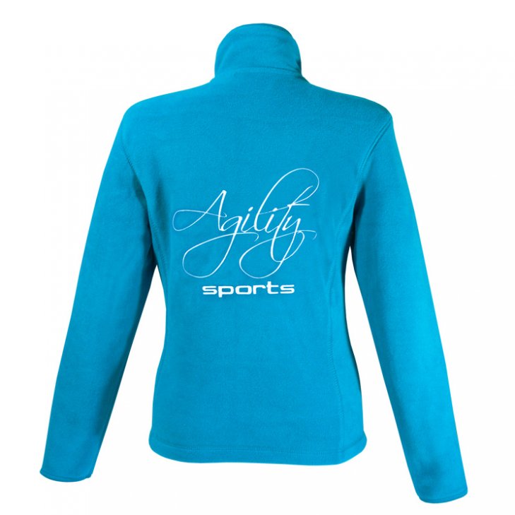 Fleece jacket for women in tropical blue. On the back curved "Agility Sports" lettering in silver (embroidered)