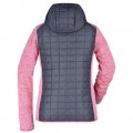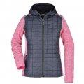 Women Hybrind Knit-Fleece-Jacket with hood in pink/darkgrey melange. - front, back part and hood in quilted check design 2 zipped side pockets, 2 inside pockets. On the left sleeve an "Agility Sports" lettering in darkgrey (embroidered).