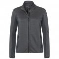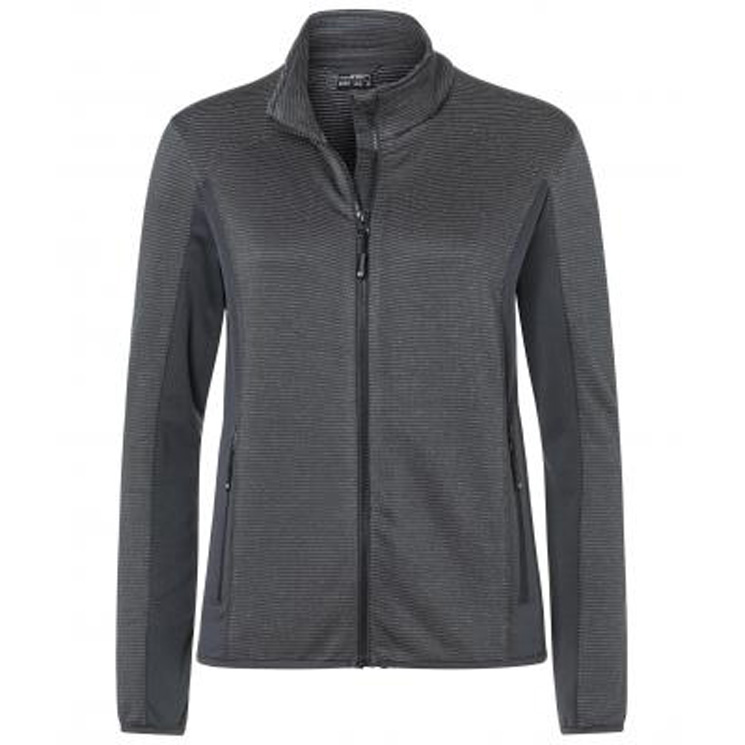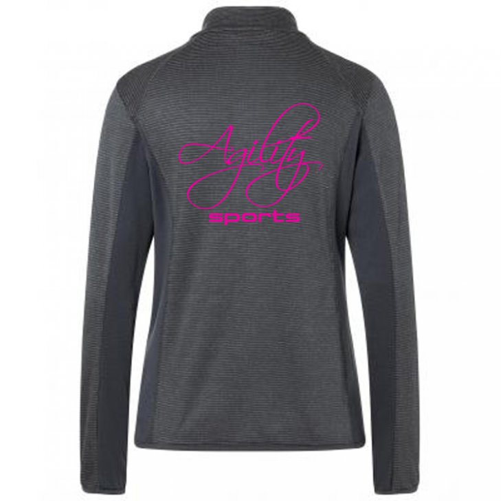Women Stretch Fleece-Jacket in black. Contrast colored inserts and flatlock seams. 2 side pockets with zip. Smooth exterior with a subtle stripe look, roughened inside. On the back curved "Agility Sports" lettering in pink (embroidered).