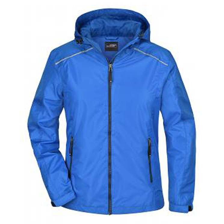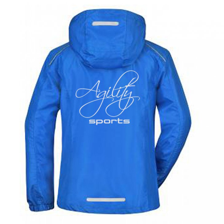 Rain jacket for women in blue. Wind and waterproof (3,000mm water column). Breathable. Two zipped side pockets and inside pocket. On the back curved "Agility Sports" lettering in silver (reflective).