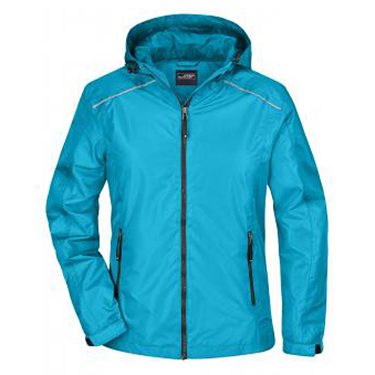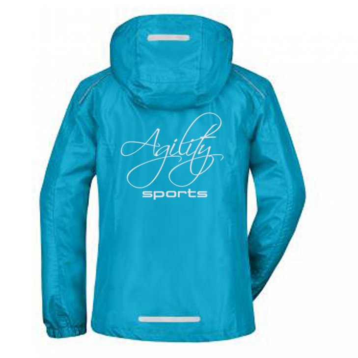 Rain jacket for women in turquoise. Wind and waterproof (3,000mm water column). Breathable. Two zipped side pockets and inside pocket. On the back curved "Agility Sports" lettering in silver (reflective).