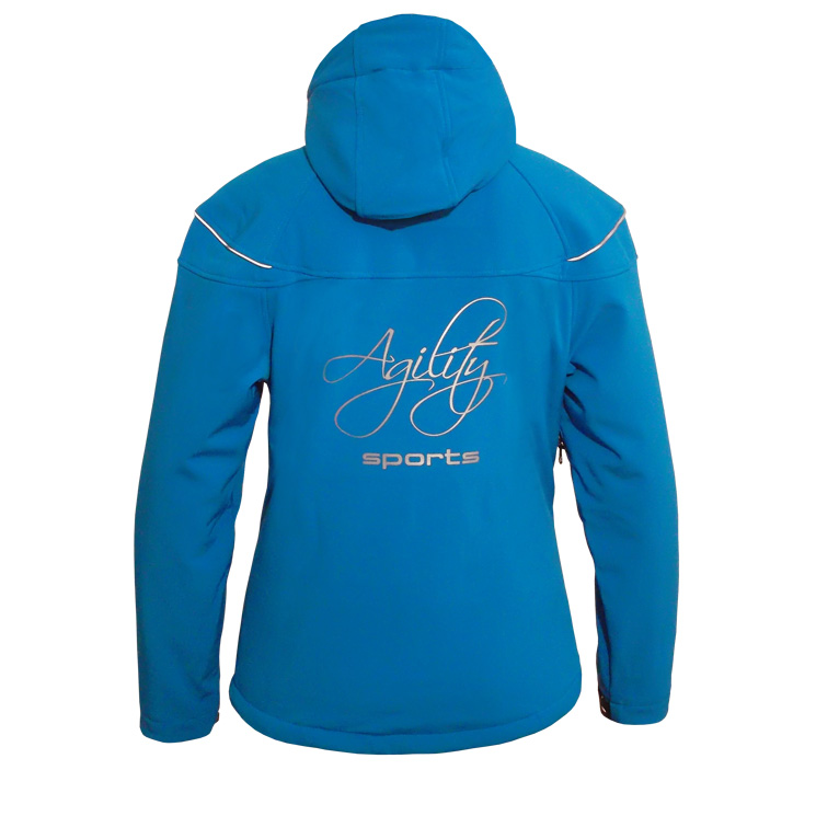 Winter Softshell Jacket with removable hood for women in blue, on the back curved "Agility Sports" lettering in silver