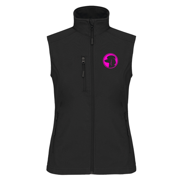 Softshell vest for women in black, on the back a Poodle head silhouette and a "Poodle" lettering in pink. On the left breast another Poodle head in pink.