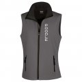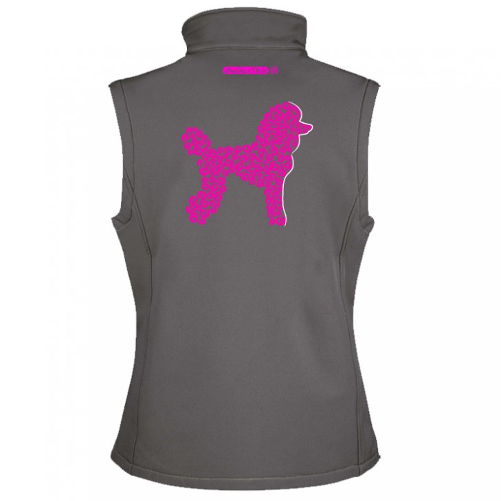 Softshell vest for women in grey, on the back a Curly-Poodle in pink. On the left breast a vertical "Poodle" lettering in white.