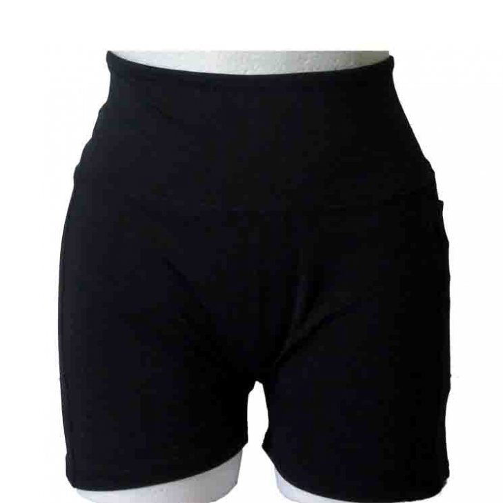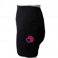 Sports shorts for women in the colour black. High cut with elastic waistband and completely stretchy. The shorts have a pocket on the left leg. There is a pink paw on it..