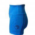 Sports shorts for women in the colour turquoise. High cut with elastic waistband and completely stretchy. The shorts have a pocket on the left leg. There is a black paw on it.