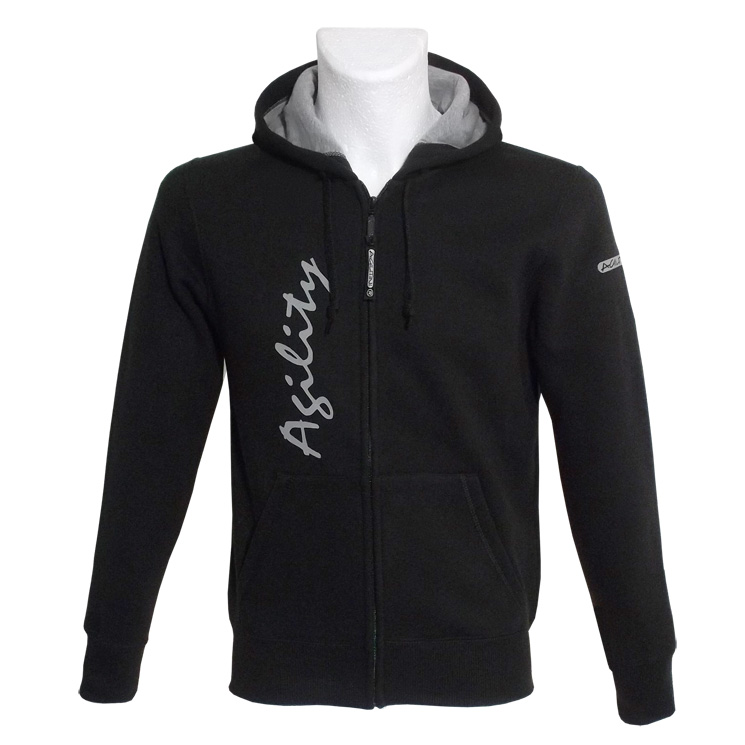Unisex sweatshirt jacket hooded with kangaroo pocket in black. Up front, next to the zipper a "Agility" lettering - on end - in grey. “Agility” lettering on the back, optionally in pink or green.