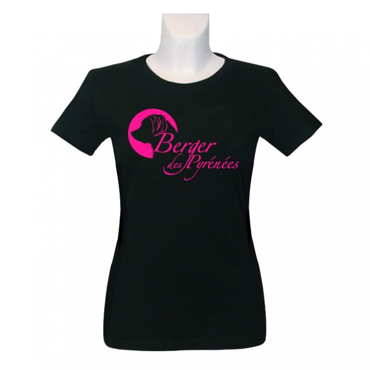 T-Shirt for women in black with a Berger-head-silhouette and a "Berger des Pyrénées" lettering in pink.