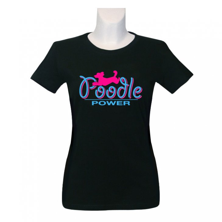 T-Shirt for women in black with a jumping Poodle in pink and a "Poodle-Power" lettering in blue/pink