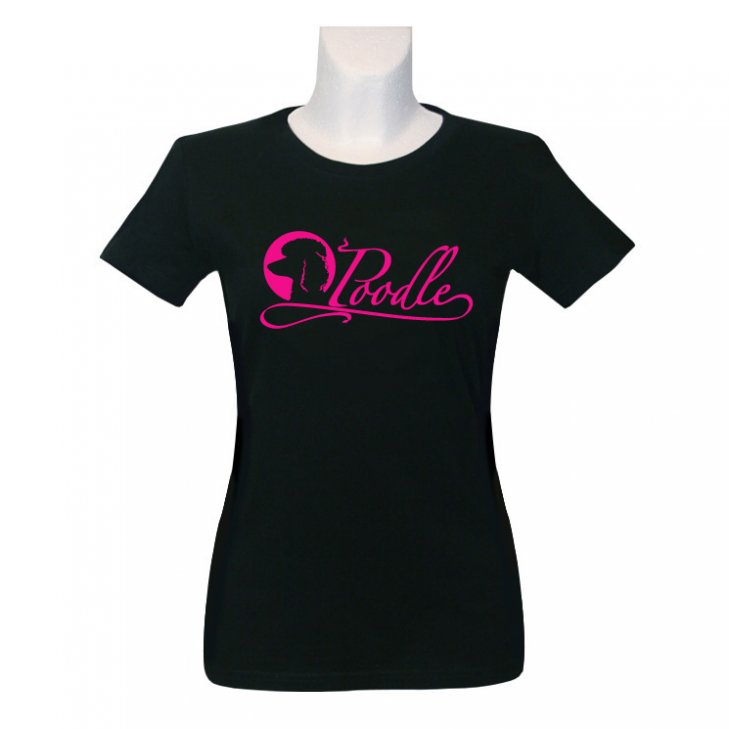T-Shirt for women in black with a poodle head silhouette and a "poodle" lettering in pink