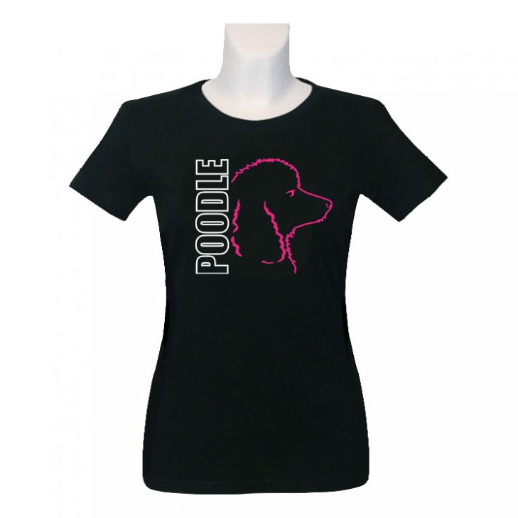 T-Shirt for women in black with a Poodle head silhouette in pink and a lettering in white.