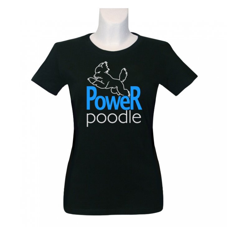 T-Shirt for women in black with a jumping Poodle in silver and a "Power poodle" lettering in blue/silver.