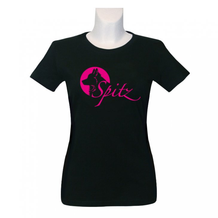 T-Shirt for women in black with a Spitz head silhouette and a "Spitz" lettering in pink