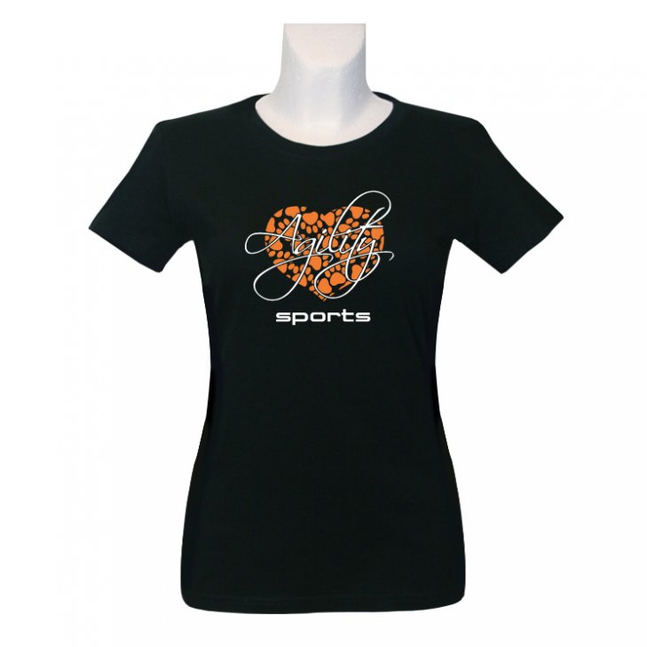 T-Shirt for women in black with orange heart and curved "Agility Sports" lettering in white