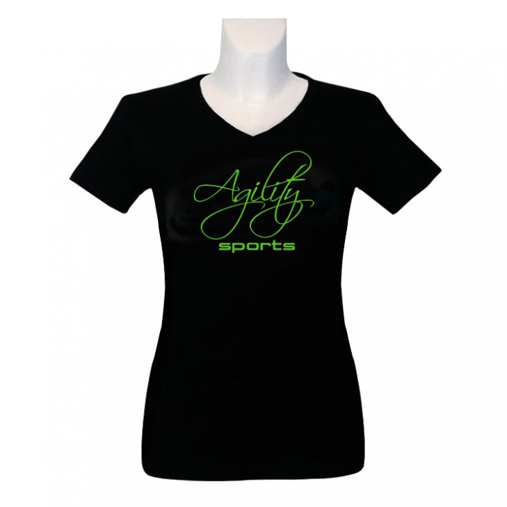 T-Shirt for women with V-neck in black with a curved "Agility" lettering in green