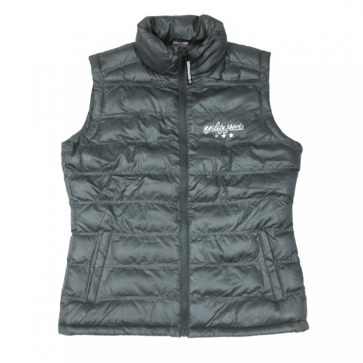 Padded vest for women in black with polyester filling. Two zipper pockets on the side and a zipped pocket inside. Hem with adjustable drawcord. On the chest an "Agility Sports" imprint in grey.