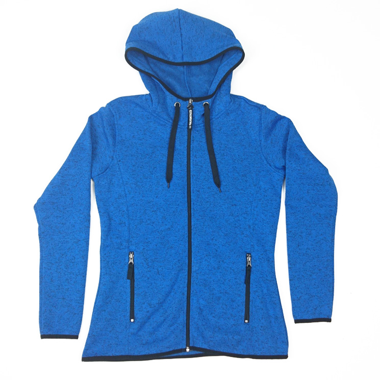 Damen Strick Fleece-Jacke mit Kapuze in blau Kontrastfarbene Einfassung an Ärmelbündchen, Kapuze und Untertritt Zwei Seitentaschen mit kontrastfarbenem Reißverschluss. Auf dem Rücken geschwungener "Agility Sports" Schriftzug in hellblau (gestickt).