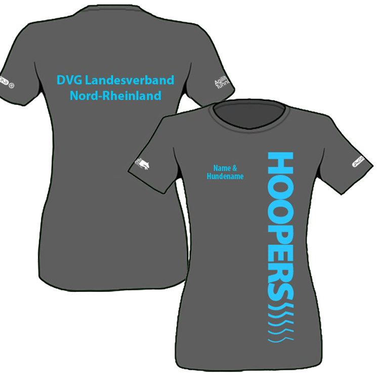 Das T-Shirt mlit Rundhals in grau mit einem blauenHooperws-Schriftzug auf der linken Vorderseite. Rechts auf Brusthöhe wird Ihr Name, sowie der Name Ihres Hundes stehen. Auf der Rückseite steht ebenfalls in blau der Schriftzug: DVG Landesverband Nord-Rheinland. Das T-Shirt gibt es für Damen und Herren.